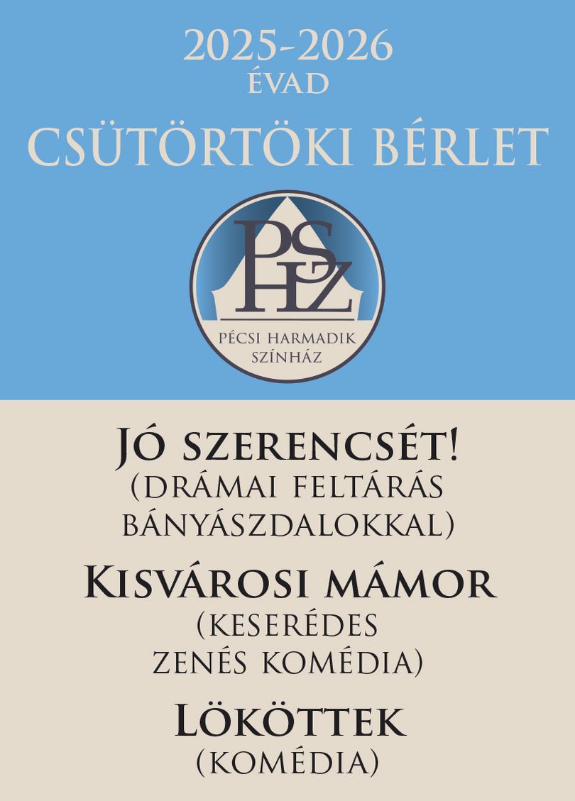 Csütörtöki bérlet Pécsi Harmadik Színház, Színházterem 7633 Pécs, Hajnóczy J. u. 41. A bérlet előadásai csütörtöki napokon kerülnek műsorra